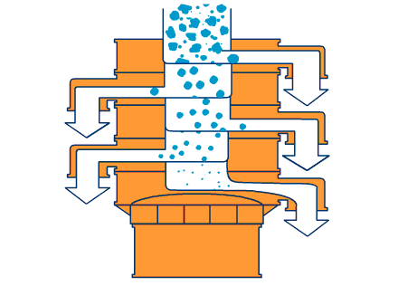 旋轉(zhuǎn)篩粉機采用YZUL立式振動電機作為激振源,通過振動電機上下兩端的偏心重錘將旋轉(zhuǎn)運動轉(zhuǎn)變?yōu)樗健⒋怪薄A斜的三次元運動,并傳遞到篩粉機的篩面上;物料通過入料口進入設(shè)備內(nèi),根據(jù)不同物料篩分要求,物料經(jīng)過1-5層采用不同目數(shù)的金屬編織篩網(wǎng)的篩分層,在這個過程中,位于各層的篩網(wǎng)下的清網(wǎng)裝置(彈跳球)通過頻率振動不斷撞擊篩網(wǎng),使篩網(wǎng)上層物料能夠順暢的透網(wǎng)篩分,并有效解決了物料堵網(wǎng)問題出現(xiàn),不同目數(shù)的物料通過各層對應(yīng)目數(shù)的篩網(wǎng)后在各層的出料口排出,實現(xiàn)篩選除雜或過濾分級的目的。調(diào)節(jié)上、下兩端的相位角,可以改變物料在篩面上的運動軌跡。