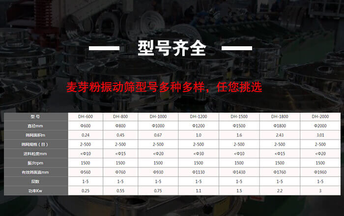 振動篩的型號有:DHC-400;DHC-600;DHC-800;DHC-1000;DHC-1200;DHC-1500;DHC-1800;DHC-2000,麥芽粉振動篩型號多種多樣,任您挑選
