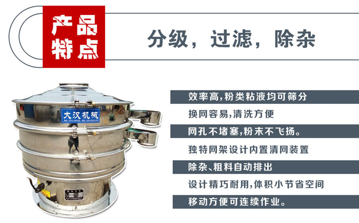 ☆ 效率高、設(shè)計(jì)精巧耐用,粉類、粘液均可篩分。 ☆ 換網(wǎng)容易、操作簡(jiǎn)單、清洗方便。 ☆ 網(wǎng)孔不堵塞、粉末不飛揚(yáng)、可篩至400目或0.028mm。 ☆ 雜質(zhì)、粗料自動(dòng)排出,可以連續(xù)作業(yè)。