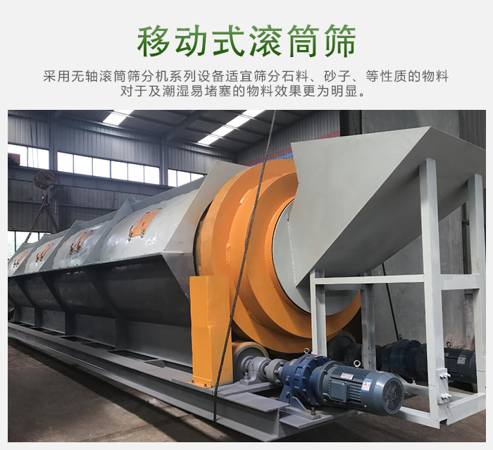 移動式滾筒篩沙機被廣泛應用于礦山、建筑、交通、化工等行業。滾筒篩沙機常用在粗細物料的分級篩選,從而提高物料的質量。