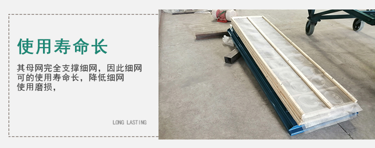 4、其母網完全支撐細網,因此細網可獨得較長之壽命,而降低細網耗材使用,淤長時間 之生產過程可降低諸多成本。